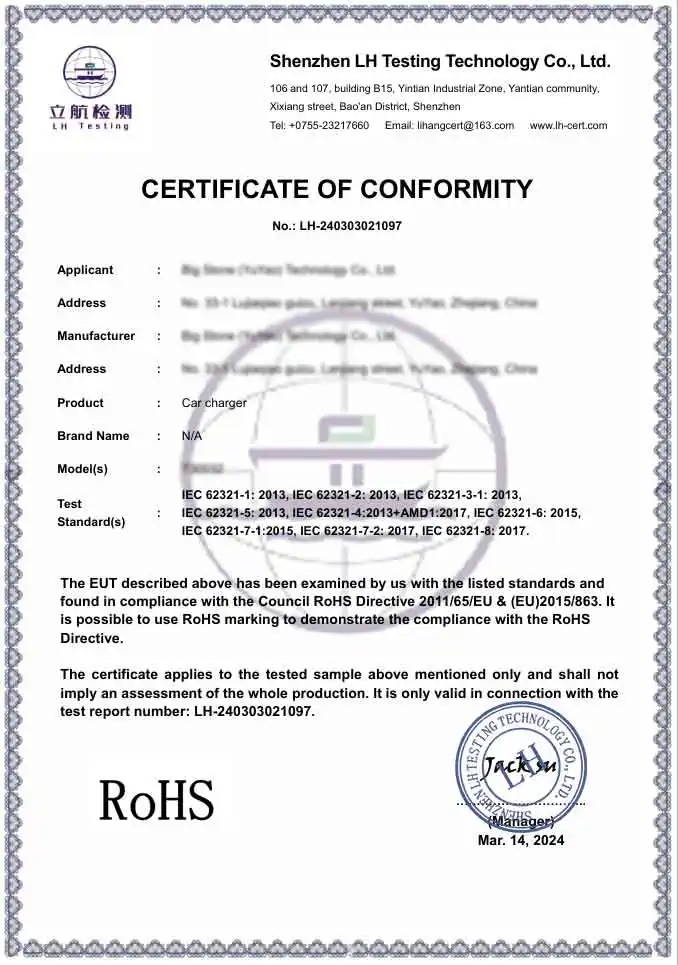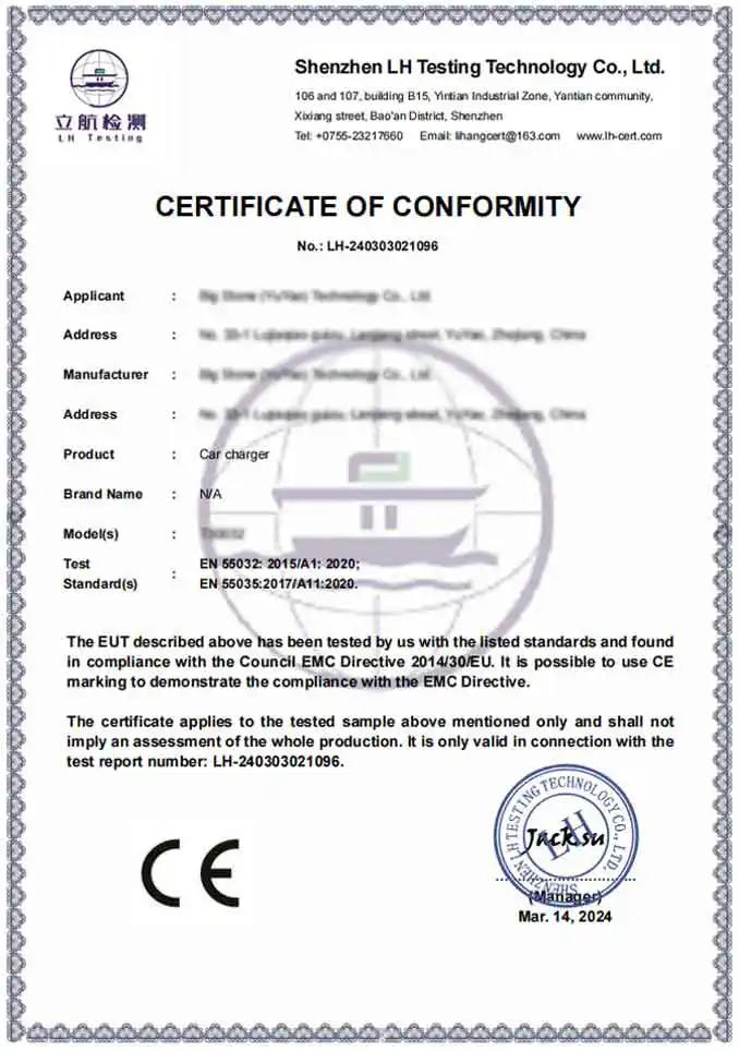 ตอบ: ในฐานะโรงงานมืออาชีพ ผลิตภัณฑ์ของเราจึงปฏิบัติตามมาตรฐานความปลอดภัยและสิ่งแวดล้อมระดับสากลอย่างสมบูรณ์ เราจัดหาผลิตภัณฑ์ที่ได้รับการรับรอง CE และ RoHS นอกจากนี้ โรงงานผลิตของเรายังได้รับการรับรอง BSCI และ ISO เพื่อให้มั่นใจว่าอะแดปเตอร์เครื่องชาร์จในรถยนต์ของเราเป็นไปตามมาตรฐานทางเทคนิคและจริยธรรมอันเข้มงวดที่กำหนดโดยแบรนด์ระดับพรีเมียมระดับโลก