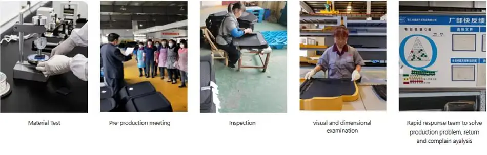 เราปฏิบัติตามมาตรฐาน ISO9001 สำหรับการออกแบบและการผลิตพรมปูพื้นรถยนต์, ISO/TSI16949 สำหรับการควบคุมคุณภาพ, ISO14001:2015 สำหรับการจัดการสิ่งแวดล้อม, BSCI สำหรับความรับผิดชอบต่อสังคม และมาตรฐาน EU REACH สำหรับวัตถุดิบ เรามีสิ่งอำนวยความสะดวกในการทดสอบภายในบริษัทเพื่อทำการตรวจสอบด้วยตนเองเพื่อให้แน่ใจว่าผลิตภัณฑ์ของเราผ่านการทดสอบที่ดำเนินการโดย SGS, Intertek หรือผู้ตรวจสอบบุคคลที่สามอื่น ๆ ที่ลูกค้าอาจต้องการ