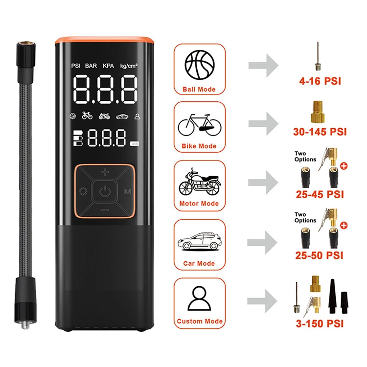 หน่วยแรงดัน: PSI, KPA, BAR, KG/CM² และโหมดอัตราเงินเฟ้อที่ตั้งไว้ล่วงหน้าสี่โหมด คุณสามารถตั้งค่าความดันของโหมดที่ตั้งไว้ล่วงหน้าทั้งสี่โหมดตามรถของคุณได้ ปั๊มลมนี้เหมาะสำหรับ: