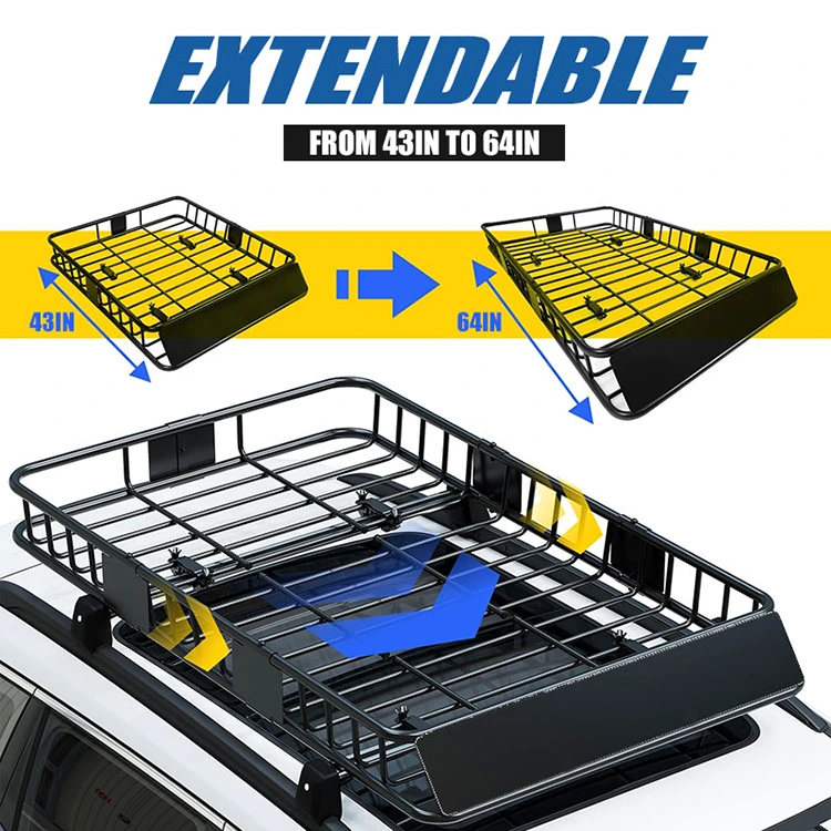 การออกแบบที่ขยายได้: ตะกร้าใส่แร็คหลังคานี้มีการออกแบบที่ชาญฉลาดที่ขยายได้—ขนาดมาตรฐาน (43" x 39" x 6") สำหรับรถยนต์ขนาดกะทัดรัด และขยายได้สูงสุด 64" สำหรับรถยนต์ขนาดใหญ่ ช่วยเพิ่มพื้นที่บรรทุกสินค้าสูงสุด รูปแบบที่พับได้ทำให้ง่ายต่อการถอดประกอบ ขนย้าย และจัดเก็บเมื่อไม่ได้ใช้งาน เหมาะสำหรับการเดินทางและการจัดเก็บที่ยืดหยุ่น