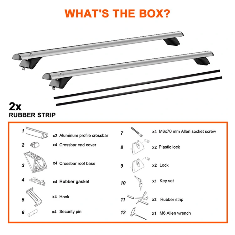ออกแบบมาเพื่อยานพาหนะที่มีราวกั้นข้างเตียงแบบฝัง ครอสบาร์แร็คหลังคาเหล่านี้ เป็นฐานที่แข็งแรงสำหรับการขนย้ายสัมภาระ จักรยาน หรืออุปกรณ์ตั้งแคมป์ โครงสร้างน้ำหนักเบา 14 กก. ผสมผสานอลูมิเนียมอัลลอยด์ที่ทนต่อการกัดกร่อนและพลาสติกที่ทนต่อแรงกระแทก จึงมั่นใจได้ถึงความทนทาน อุปกรณ์เสริมประกอบด้วยกุญแจ 2 ดอก ประแจหกเหลี่ยม คู่มือการใช้งาน และแถบ PVC เพื่อการติดตั้งที่รวดเร็ว