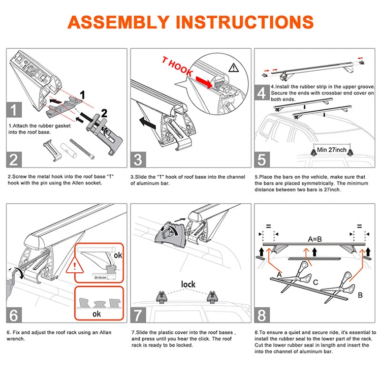 แถบครอสบาร์แร็คหลังคาเหล่านี้ติดตั้งง่าย: มีประแจหกเหลี่ยมสำหรับการติดตั้ง 10 นาที; คู่มือพร้อมภาพประกอบทีละขั้นตอน